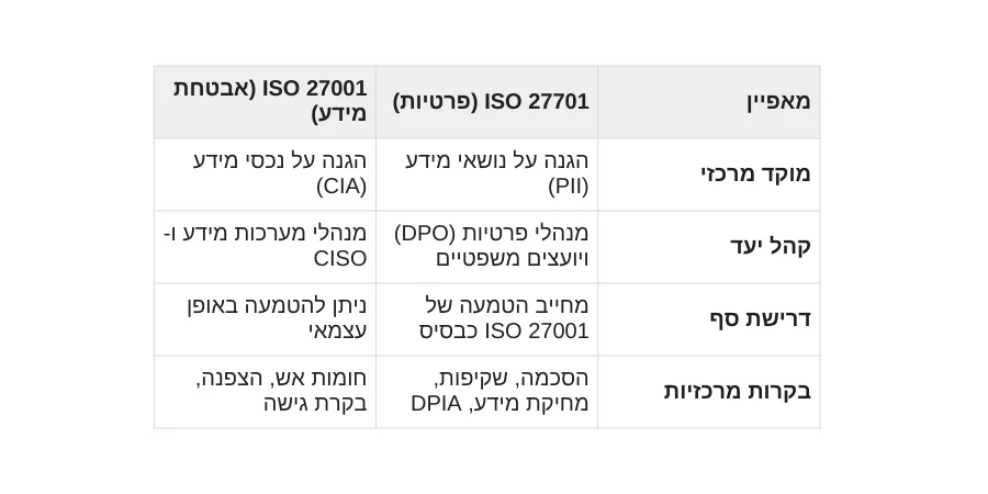 ISO 27001 (אבטחת מידע): מתמקד ב"קירות" – איך להגן על המידע מפני פריצות, גניבות או אובדן. הוא עוסק בסודיות, שלמות וזמינות המידע.